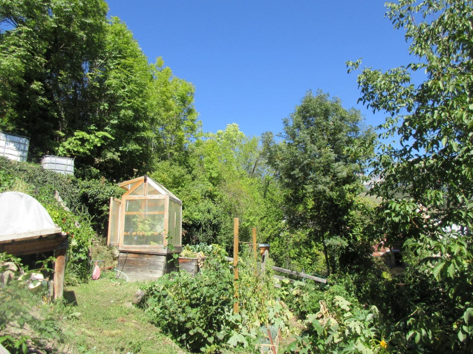 Le terrain, très agréable, a été aménagé en différents espaces : places de parking en contre-bas, grande terrasse, espace jeux pour les enfants et magnifique potager.
